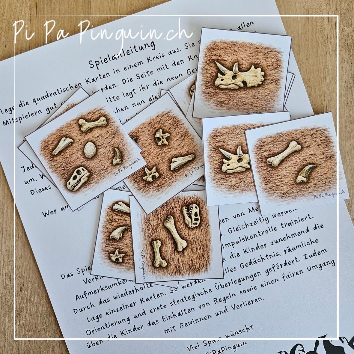 Auf jeder Karte liegen Dinosaurier-Fossilien im Sand, die in unterschiedlichen Mengen dargestellt sind. Wer die gewürfelte Menge zuerst entdeckt, dreht die Karte um.